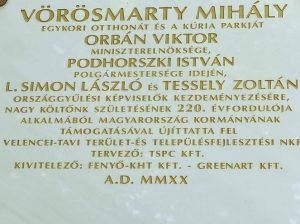 A másik emléktábla 2020-as és Vörösmarty nevével kezdődik, hogy aztán végestelen-végig folytatódjék mindenféle más nevekkel. Megtudjuk, hogy a házat és a parkot Orbán Viktor miniszterelnöksége és Podhorszki István polgármesteri ciklusa alatt újították fel, L. Simon László és Tessely Zoltán képviselők kezdeményezésére, megtudjuk, mely cégek tették, megtudjuk a tervezői munkálatokat végző cég nevét is, egyáltalán, egyvalamit nem tudunk meg: hogy végső soron ki az a Vörösmarty Mihály, akinek a nyakába kapaszkodva állított magának fércnél maradandóbb emléket ez a sok kerti törpe?