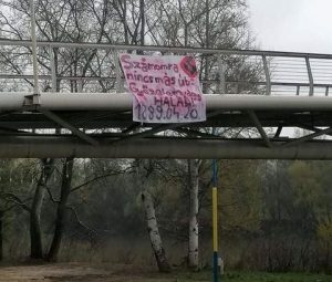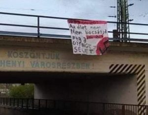 A két férfi két nappal később, április 20-án este a Pozsonyi úti aluljáró belváros felőli bejárata fölé egy másik molinót függesztett ki, amelyen „Az élet nem nem bocsátja meg a gyengeséget” felirat mellett szintén egy horogkereszt részlete volt látható. A kihelyezés után tűnt fel nekik, hogy tévedésből kétszer írták a „nem” szót, ezért hazaindultak festékszóróért.