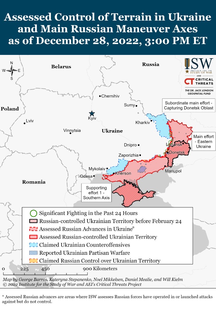 A Bakhmut elleni orosz offenzíva valószínűleg kulminálódik, ahogyan azt az ISW december 27-én előre jelezte. Az amerikai katonai doktrína a kulminációt úgy határozza meg, mint „azt a pontot, amikor egy erő már nem képes folytatni a műveleti formáját, támadást vagy védekezést”, és „amikor egy erő nem tudja folytatni a támadást, és védekező pozíciót kell felvennie, vagy műveleti szünetet kell tartania.” Ha az orosz hadsereg Bakhmutban valóban kulminálódott, akkor ennek ellenére folytathatják az agresszív támadást. A kulminált orosz csapatok továbbra is folytathatják a Bakhmut elleni hatástalan, szakasz-szintű támadásokat, bár ezek a támadások nagy valószínűséggel nem érnének el jelentős műveleti előnyöket.