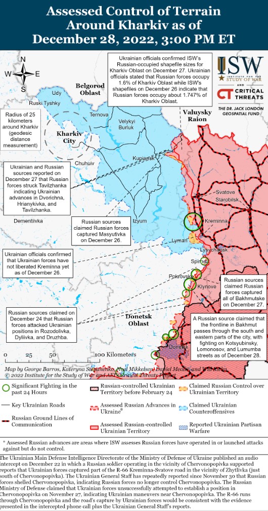 Az ukrán hadsereg a jelentések szerint december 28-án folytatta az ellentámadást Kreminna irányában. Egy orosz blogger azt állította, hogy az ukrán egységek támadást hajtottak végre Cservonopopivka közelében (6 km-re Kreminnától északra), ahol állítólag harcok folynak az orosz és ukrán csapatok között a Kreminnába vezető R–66-os autópálya egy szakaszáért. Az ukrán erők keleti csoportjának szóvivője, Szerhij Cserevaty kijelentette, hogy az ukrán alakulatok folytatják a Kreminna felszabadítására irányuló műveleteket, bár hangsúlyozta, hogy túl korai lenne a település elfoglalásáról beszélni. Ukrán tisztviselők arról számoltak be, hogy orosz civil dolgozók és az orosz katonai parancsnokság evakuálta Kreminnát, ami valószínűleg arra utal, hogy az oroszok készülnek a település elfoglalására irányuló intenzívebb ukrán erőfeszítésekre. A Luhanszki Népköztársaság (LNK) volt oroszországi nagykövete, Rodion Miroshnik azt állította, hogy az ukrán egységek továbbra is hosszú távú módszeres szondázást folytatnak Kreminna környékén lévő orosz állások ellen, és súlyos veszteségeket szenvednek ezekben a műveletekben. Egy BARS–13 (orosz harci tartalékos) egység kötelékébe tartozó forrás azt állította, hogy az ukránok Kreminna elleni támadásra készülnek egyszerre három irányból. Az ISW nem készít értékelést konkrét jövőbeli ukrán műveletekről. Egy közösségi médiaforrás december 27-én olyan felvételeket tett közzé, amelyek szerint az ukrán csapatok elfoglalták Dibrovát (Kreminnától 5 km-re délnyugatra), bár az ISW nem tudja függetlenül ellenőrizni ezt az állítást.