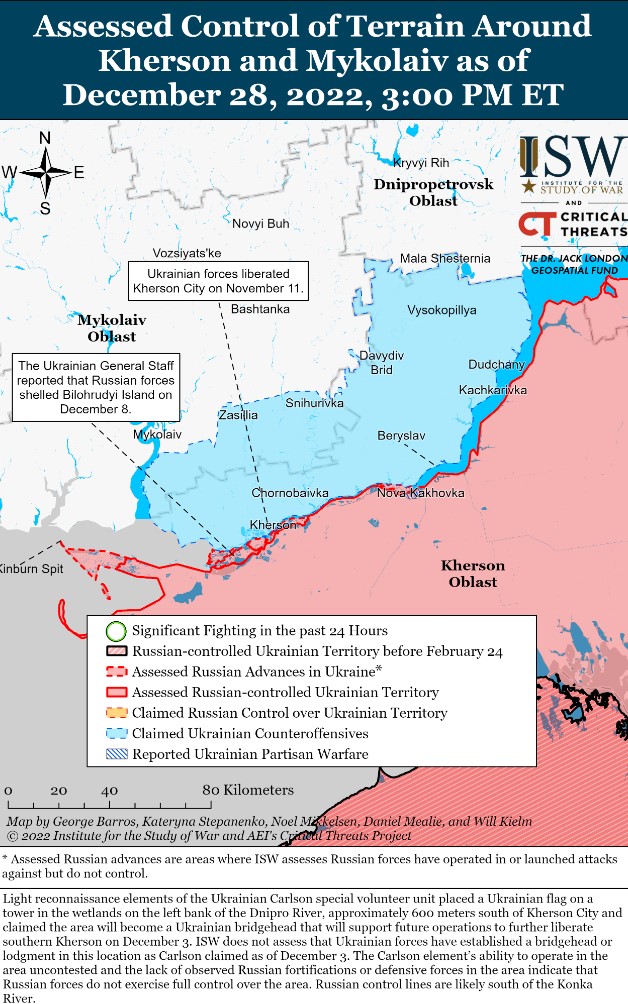 Orosz források továbbra is tisztázzák a jelenlegi orosz haderő összetételét Dél-Ukrajnában. December 28-án orosz tisztviselők küldöttsége, köztük Szergej Kirijenko, az Elnöki Végrehajtó Hivatal első helyettes vezetője és Andrij Turcsak, a Föderációs Tanács helyettes vezetője meglátogatta a 98. légideszant hadosztály katonáit, és ellenőrizte a védelmi vonalakat a Herszon terület keleti partján. Orosz források azt is jelezték, hogy a Donyecki Népköztársaság (DNK) 1. hadtestének és a Keleti Katonai Körzet 36. Összhaderőnemi Hadseregének 37. Különálló Gárda Motorizált Lövészdandárjának elemei védelmi műveleteket folytatnak a front nem meghatározott szektorai mentén a Zaporizzsjai Területen. A 37. Különleges Gárdista Motorizált Lövészdandár korábban, a novemberi visszavonulás előtt a Herszoni Terület nyugati (jobb) partján tevékenykedett. Az oroszok folytatták a rutinszerű ágyúzást az érintkezési vonal mentén Herszon, Zaporizzsja, Dnyipropetrovszk és Mikolajiv területeken.