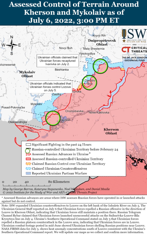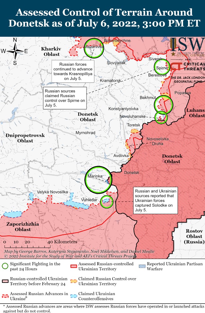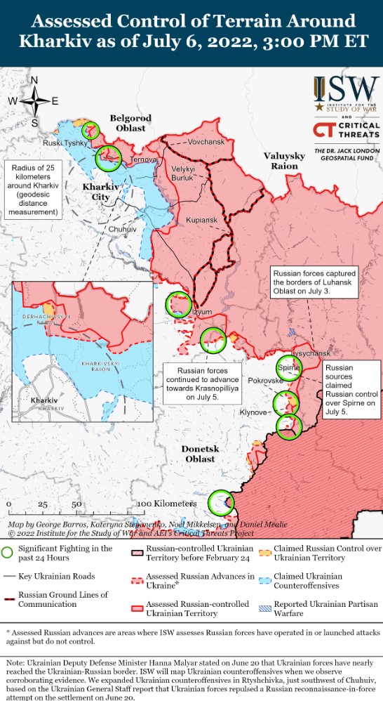 Július 6-án a háború kezdete óta először nem volt állítólagos vagy becsült orosz területi nyereség Ukrajnában, ami alátámasztja az ISW értékelését, miszerint az orosz erők nagyrészt hadműveleti szünetet kezdeményeztek. Az orosz védelmi minisztérium a háború kezdetétől minden nap területi nyereséget jelentett be, de a július 3-i liszicsanszki bekerítés befejezése óta nem jelentett be új területszerzést vagy haderőmozgást. Az orosz hadsereg azonban július 6-án még mindig korlátozott és sikertelen szárazföldi támadásokat hajtott végre minden tengelyen. Az ilyen kísérletek összhangban vannak az orosz hadműveleti szünettel, amely nem jelenti és nem is követeli meg az aktív hadműveletek teljes beszüntetését. Ez ebben az esetben azt jelenti, hogy az orosz haderő valószínűleg viszonylag kis léptékű támadó akciókra fog szorítkozni, miközben megpróbálja megteremteni a feltételeket a jelentősebb támadó műveletekhez, és újjáépíteni a harci képességeket, amelyek szükségesek ahhoz, hogy megkíséreljék ezeket az ambiciózusabb vállalkozásokat.