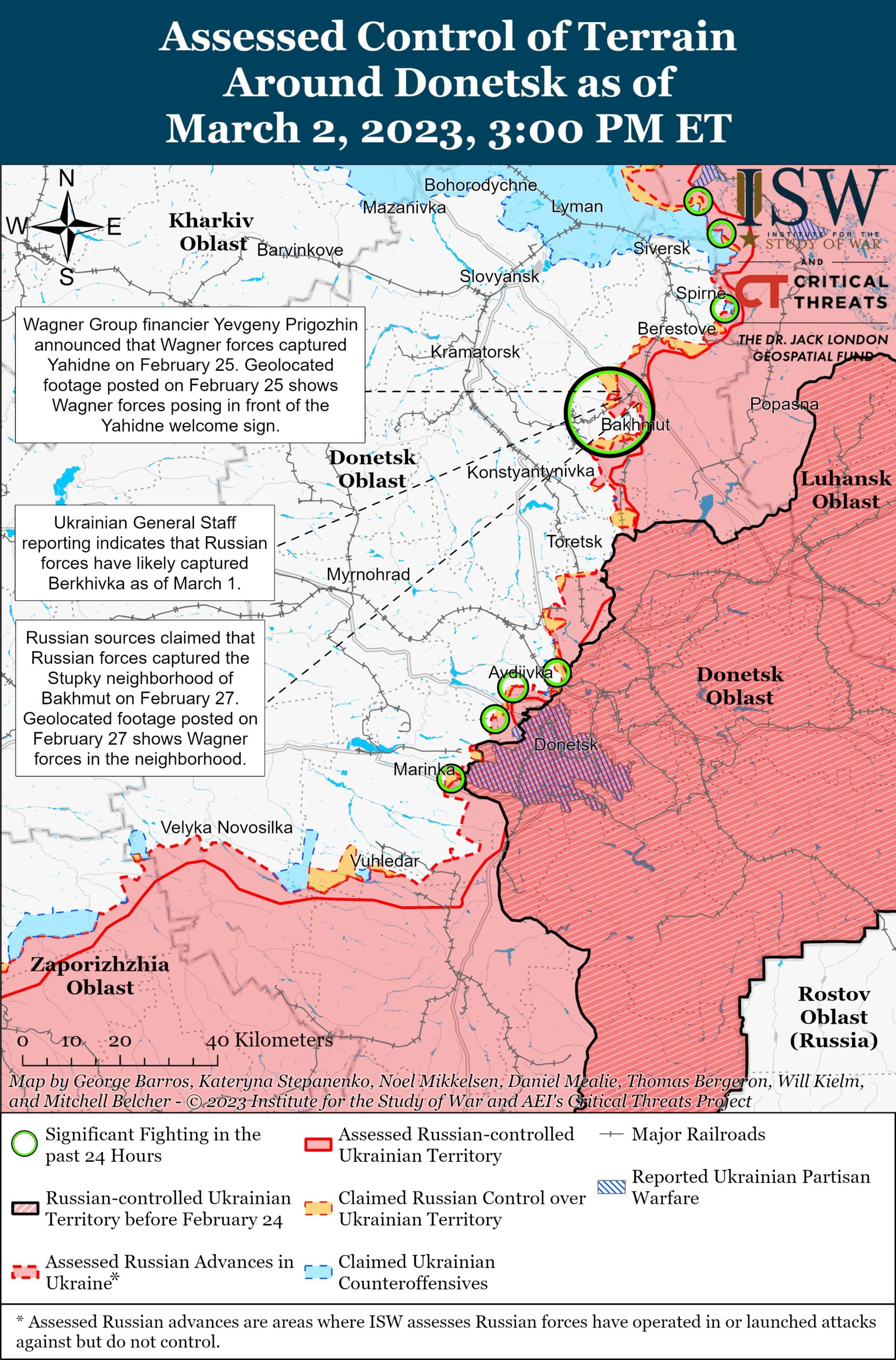 Az orosz hadsereg március 2-án folytatta a Bakhmut körüli támadó hadműveleteket. Az ukrán vezérkar jelentése szerint az ukrán egységek visszaverték az orosz támadásokat Bakhmut, Orikhovo-Vaszilivka (11 km-re északnyugatra Bakhmuttól), Dubovo-Vaszilivka (7 km-re északnyugatra Bakhmuttól), Khromove (3 km-re nyugatra Bakhmuttól) és Ivanivszke (6 km-re nyugatra Bakhmuttól) közelében. A Khromove közelében visszavert orosz támadás arra utal, hogy az orosz csapatok valószínűleg Bakhmuttól északnyugatra nyomultak előre. A március 2-án közzétett geolokációs felvételek azt jelzik, hogy az orosz egységek valószínűleg Dubovo-Vaszilivkától délre szereztek előnyöket. Egy orosz milblogger azt állította, hogy a Wagner-csoport harcosai előrenyomultak Hrihorivka ( Bakhmuttól 10 km-re északnyugatra) és Bohdanivka (Bakhmuttól 6 km-re nyugatra) irányába, és támadó műveleteket hajtottak végre Fedorivka (Bakhmuttól 17 km-re északra), Rozdolivka (Bakhmuttól 17 km-re északra) és Veszele (Bakhmuttól 18 km-re északkeletre) közelében. A március 2-án közzétett geolokációs felvételek azt mutatják, hogy az orosz csapatok valószínűleg előrenyomultak Bakhmut keleti részén. Orosz milbloggerek azt állították, hogy az orosz egységek folytatták a támadó műveleteket Bakhmut déli részén, Opitnyétől (Bakhmuttól 4 km-re délre) észak felé haladva a város keleti részén, és Bakhmut északi részén Jahidnétől (Bakhmuttól 2 km-re északra) dél felé haladva. Az orosz alakulatok folytatták a támadó műveleteket Bakhmut déli részén. A március 2-án közzétett geolokációs felvételek szerint az orosz csapatok valószínűleg Bila Hora ( Bakhmuttól 13 km-re délnyugatra) közelében nyomultak előre. Orosz milbloggerek azt állították, hogy Wagner harcosok támadásokat hajtottak végre Bila Hora és Csasziv Jar (Bakhmuttól 12 km-re nyugatra) irányában, és megpróbálják elvágni a T0504-es autópálya egy szakaszát. A Donyecki Népköztársaság (DNK) Népi Milíciája azt állította, hogy a DNK 132. dandárja az 1. hadtest (korábban a DNK Népi Milícia 3. dandárja) Toreck (Bakhmuttól 22 km-re délnyugatra) irányába nyomult előre.