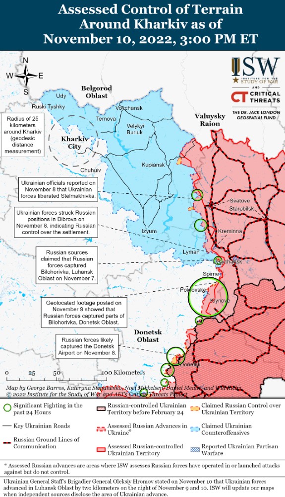 Az ISW szerint az ukrajnai harcok nem fognak leállni vagy patthelyzetbe kerülni a téli időjárás miatt, a hibás nyugati feltételezések ellenére. Az NBC News november 9-én arról számolt be, hogy egyes amerikai és nyugati védelmi tisztviselők „a harcok várható téli lelassulását a diplomáciai tárgyalások megkezdésének lehetőségeként szemlélik Oroszország és Ukrajna között.” Az őszi és tavaszi sár lelassíthatja vagy megállíthatja a katonai előrenyomulást, ahogyan a hibás vagy elégtelen téli felszerelés is. Egyes katonai felszereléseket a hidegebb időjáráshoz kell igazítani, és a felszerelés vagy a lőszerek hiánya a logisztikai nehézségek – és nem a téli időjárás – miatt lassíthatja az előrenyomulást. A téli időjárás aránytalanul nagy kárt okozhat a rosszul felszerelt orosz haderőnek Ukrajnában, de a jól felszerelt ukrán egységek valószínűleg nem fogják leállítani ellentámadásaikat a téli időjárás beköszönte miatt, és a fagyott terepet kihasználva könnyebben tudnak majd mozogni, mint a sáros őszi hónapokban. Ha a harcok ezen a télen leállnak, az a logisztikai kihívásoknak és mindkét oldalon több hadjárat csúcspontjának lesz köszönhető. A Donyeck, Luhanszk, Herszon és Zaporizzsja megye teljes területének elfoglalására irányuló orosz hadjáratok mind hónapokkal ezelőtt tetőztek (annak ellenére, hogy az orosz hadsereg ismételten ragaszkodott az eredménytelen támadások indításához), és az orosz csapatok a frontvonal nagy részén szilárdan védekező pozícióban vannak.