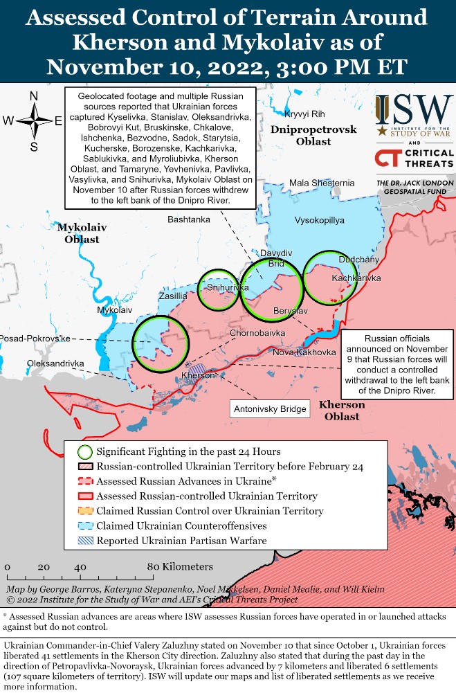 Az ukrán hadsereg november 10-én folyamatosan nyomult előre a Herszoni Területen, miközben az orosz csapatok visszavonulást hajtanak végre a Dnyeper folyó keleti (bal) partjára. Ukrán katonai illetékesek és a közösségi média geolokációs felvételei megerősítik, hogy az ukrán csapatok az elmúlt 24 órában Herszon városától északnyugatra, nyugatra és északkeletre előretörtek, és egyes területeken akár 7 km-t is haladtak előre. Az orosz egységek eddig úgy tűnik, hogy viszonylag rendben visszavonulnak, és az ukrán alakulatok a várt előnyökkel haladnak anélkül, hogy az orosz csapatokat útvesztőbe terelnék, ahogyan azt a harkivi ellentámadás során tették. Az ukrán csapások augusztus óta sikeresen rontották az orosz utánpótlási vonalakat a nyugati (jobb) parton, hogy az orosz haderőt visszavonulásra kényszerítsék, és az elkövetkező napokban vagy hetekben felszabadítják a Herszoni Területet a Dnyeper folyóig. Az oroszok visszavonulása még eltart egy ideig, és a harcok folytatódni fognak az egész Herszoni Területen, ahogy az ukrán csapatok előrenyomulnak és az előre elkészített orosz védelmi vonalakkal találkoznak, különösen Herszon város környékén.